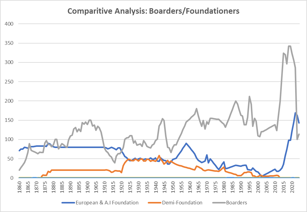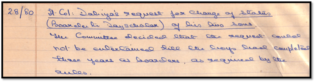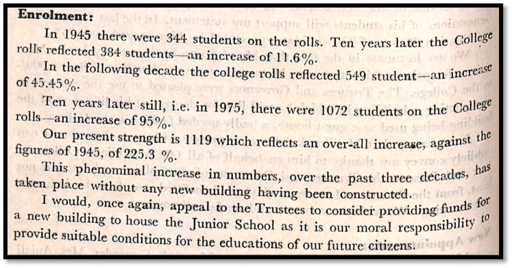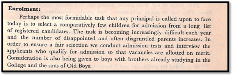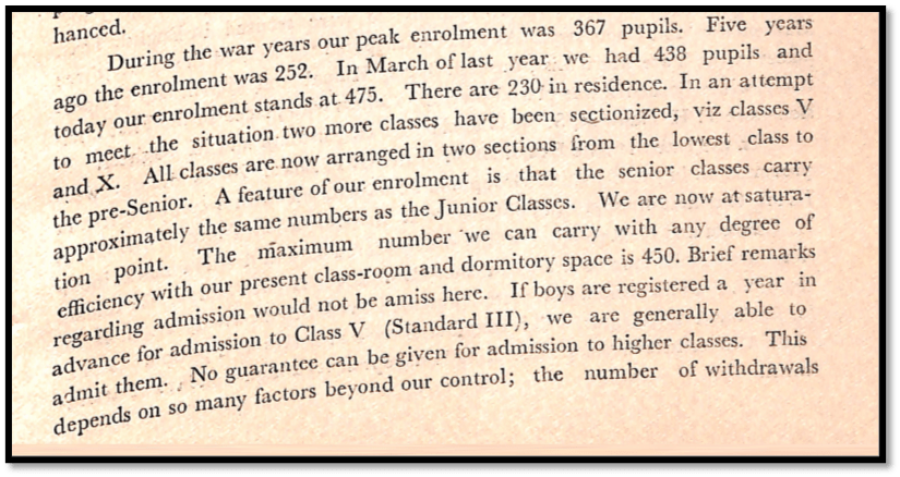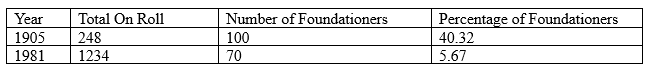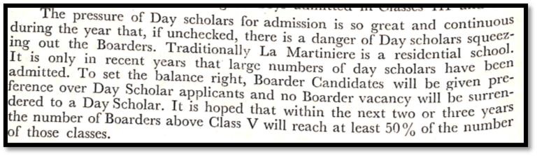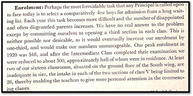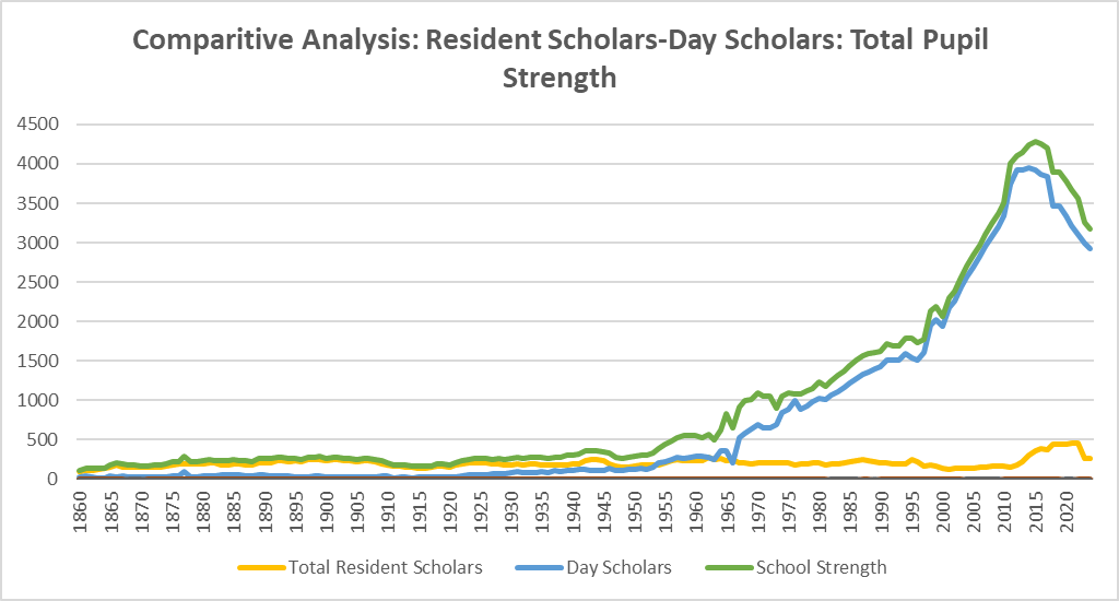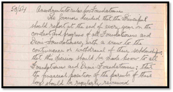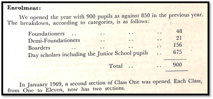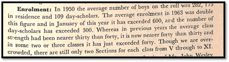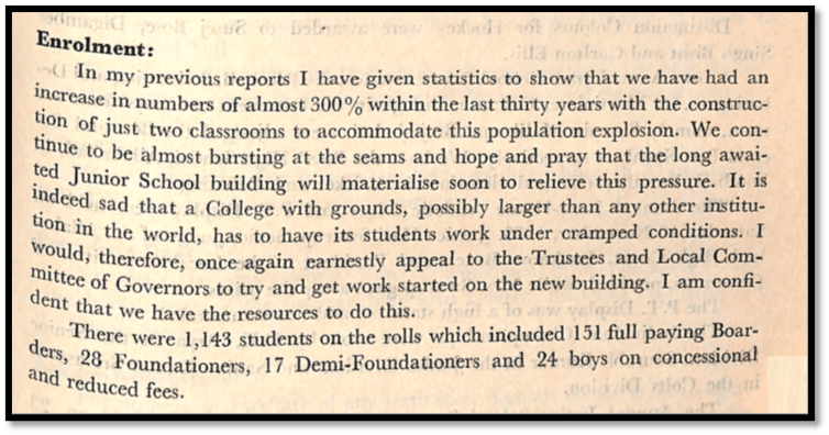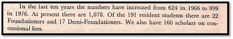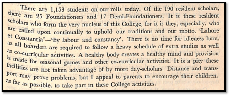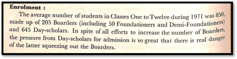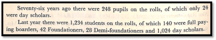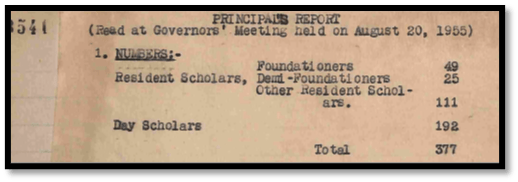 The numbers of Foundation pupils were nowhere near the arbitrary absolute number of 100, set more than a century ago. The number of paying Boarders could not inflate the expected number of resident scholars, nor establish any ratio or proportion in the context of day scholar strength.
