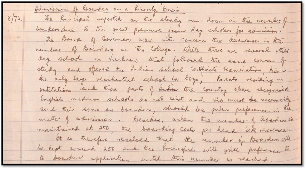In 2015, La Martiniere College had opened its doors to the first such Permanent Resident Scholar. Shubham was received on 8 October, 2015. He follows in the footsteps of Zulpheekar, the first abandoned child to be formally maintained by the generosity of the Founder, nearly 200 years ago. The Governors examined the action and recorded Resolutions in this regard:
