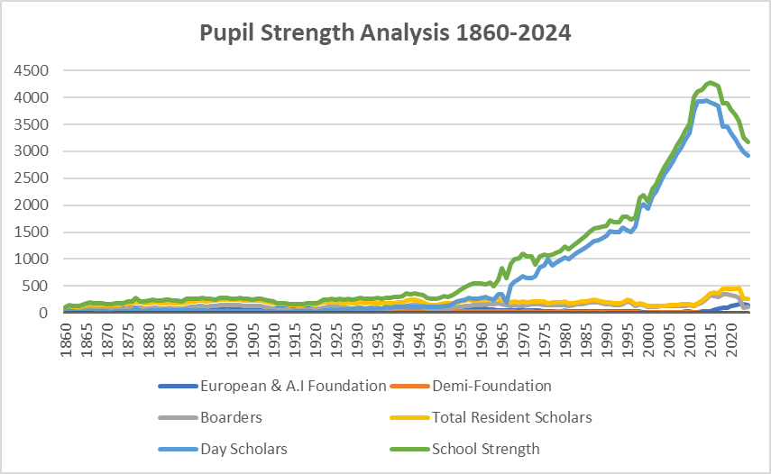 | Year | Total Strength | Day-Scholars | Boarders | Foundationers | Demi-Foundationers |