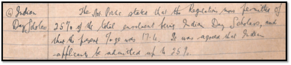 “VII Read a letter from the Inspector of Schools to the Governors asking their views on the advisability of altering the 15% rule regarding admission of Indian boys. The Governors decided that they were in favour of no change in the figure for the present but that they would communicate with the Inspector should fresh exigencies arise.”