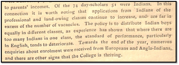 The Government Code for European Schools required that up to 15% of pupils were to be Indian boys. Principal Weir reported in 1925: