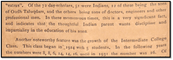 The demographics of the College increasingly began to reflect the number of Indians admitted. Figures were scrupulously maintained. In the Annual Report of 1928, the Principal reported that of the 63 day-scholars in attendance, 37 were Indians.