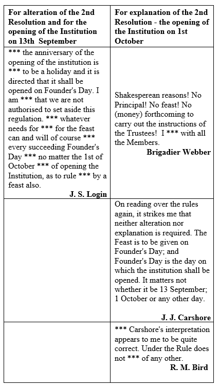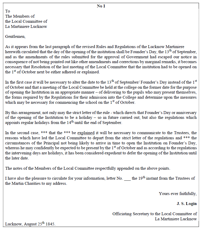Minute No I of the Local Committee of Governors was recorded by the Officiating Secretary, Dr J. S. Login. The struggles of practicability while following the letter of the law was evident at this tentative time. Much of the formality and anxiety was related to an interpretation of the fulfilment of the decretal orders of the Court regarding the date of establishment of the College. The Court had decreed that the College was to be opened on Founder’s Day, the 13th of September, which the Founder himself had determined should commemorate the date of his death. However, the first Principal who had been appointed could not be present in Lucknow until the 23rd of September, 1845. The opinions of the Members were solicited. This is on record as the very FIRST official Minute of the Local Committee of Governors, 180 years ago!