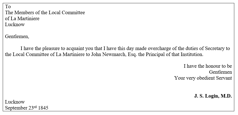 The first Principal, Mr John Newmarch, arrived in Lucknow on 23 September, 1845. The formality of taking charge as Principal and Secretary to the Local Committee of Governors was completed and recorded by Dr Login: