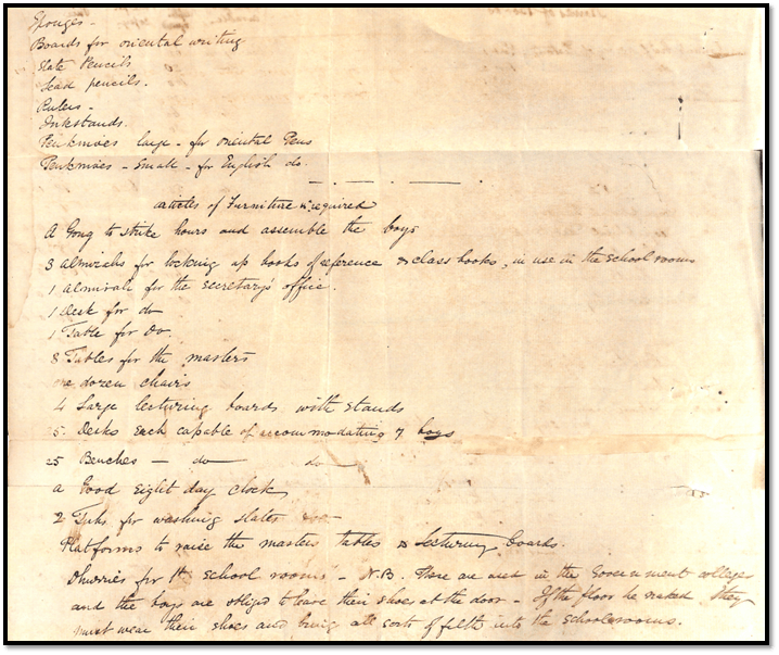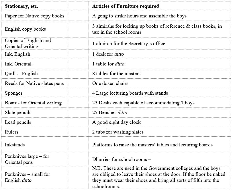 There is no record of there being any interaction between the communities of the two groups of boys. Boarding, lodging, diet, curriculum, instruction, furniture and apparatus were different. The list of items first required by the two ‘departments’ is on record. The items indicate the difference in the requirements for European scholars as contrasted with native scholars: Copy books vs slates; quills vs reeds; English ink vs oriental ink; desks and benches vs dhurries for seating.