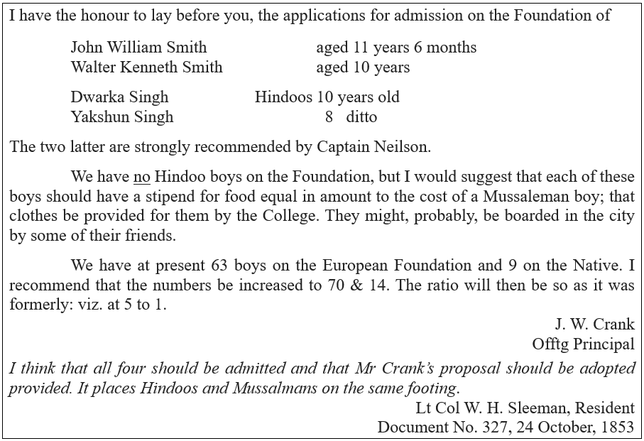“I should also bring to the notice of the Committee that an application has been duly and formally made by a boy of the Mihtur (Mehtar) caste for admission as a day scholar. It is much to be feared that this admission would tend to drive other boys from the College, but as there is no other objection to the admission of the applicant, the Principal cannot in the face of the decree which establishes the College take upon himself the responsibility of refusing his application. It appears to him a choice between injustice and inexpediency and he has requested that the advice and the directives of the Committee may be given him in the difficulty.”