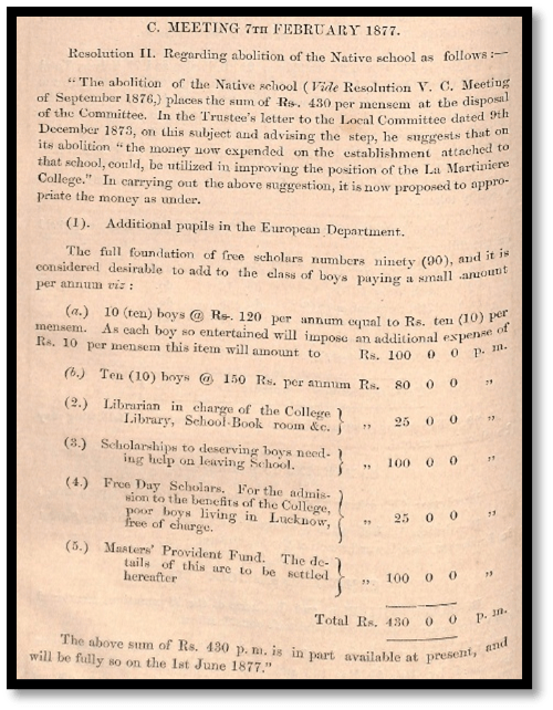 Resolution. As the Trustees find that a separate Institution in the city away from Constantia is opposed to the terms of General Martin’s Will and as the Oriental Department in Constantia which aimed at teaching Arabic and Persian proved a failure, the Members of the Committee agree with the Trustee “ that the Native School need not be settled down into a permanent annexure to the Martiniere Institution” and that “the money now expended on the establishment attached to that school should be utilised in improving the position of the Martiniere College”. They therefore vote for the abolition of the Native School to take effect from 30th November next, the end of the scholastic year.