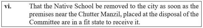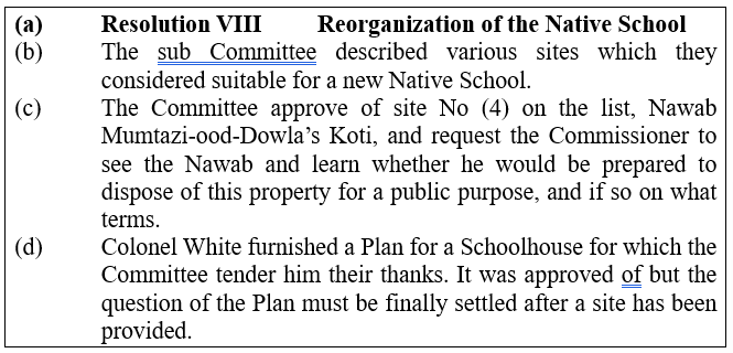 Resolved that the Principal be requested to draw up a report on the advisability of closing the Native Branch of the College (at present located in Dowlat Khana) and of making such arrangements with the Committee of the Canning College as shall ensure compliance with the terms of General Martin’s Will, while the necessity of keeping up a separate establishment for the Native Department shall be done away with.