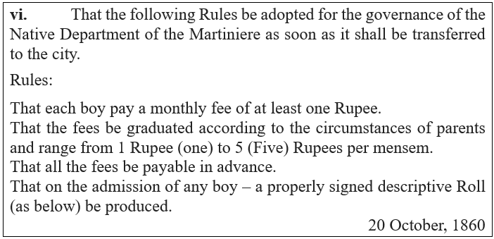 Following an outcry, the Committee, three months later, on 15 February, 1861, altered its decision regarding fees. It offered sops by reducing the base fee by 50%. A sliding scale would be followed for fees, depending on the income of the parents. In addition, a new category of Native pupil, i.e. the ‘Scholarship Holder’ was set up. This was a reinvention of the provision in the Scheme of Administration where the Martin Charities had offered education to boys of all communities and sects. The earlier Native Foundation was reinvented in this manner. Charity was no longer gratuitous but had to be earned.