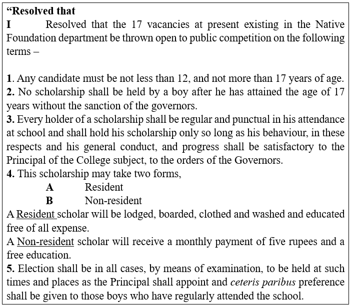 The scheme of ‘Scholarship Holders’ in the Native School was made more stringent, though an attempt was made to align the system with the original Foundation system that existed when the School began in 1845. On 29 June, 1869 the Committee: