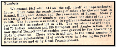 Not including the numerical strength of the Calcutta Martiniere, the number of Boarders rose considerably due to the requisitioning of school buildings and the evacuation from Burma. Some of the evacuees were offered demi-Foundationer status, considering their financial condition. These events related to World War II were presented in the Principal’s report on the year 1942.